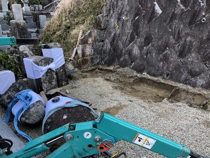 昔のお墓は、自然石のような形のものも多く、重機で釣り上げる際には、ロープやバンドなどを使用し、慎重に作業します。