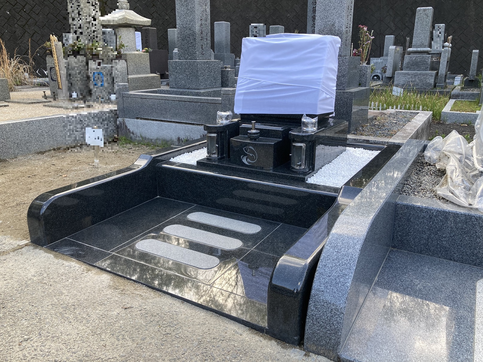 石碑と外柵が黒い石なので、お施主様とも相談して墓地の玉砂利を白玉石にしました。